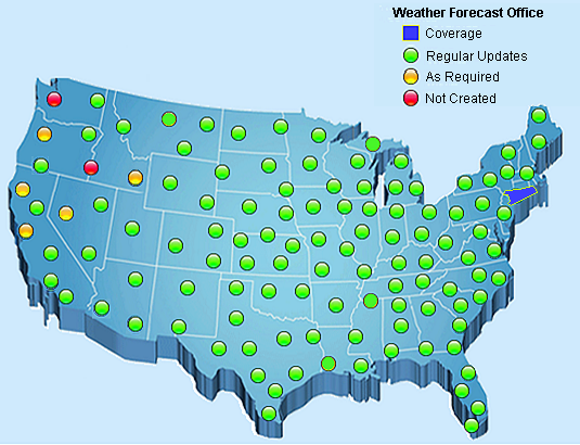 San Juan, PR Lake Charles, LA Pueblo, CO Corpus Christi, TX St. Louis, MO Reno, NV Raleigh, NC  Newport/Morehead City, NC Dodge City, KS Houston/Galveston, TX San Joaquin Valley/Hanford, CA Louisville, KY Fort Worth, TX Pittsburgh, PA Austin/San Antonio, TX Sacramento, CA Jackson, MS Phoenix, AZ Northern Indiana, IN Flagstaff, AZ Tallahassee, FL Springfield, MO Riverton, WY Blacksburg, VA Sioux Falls, SD El Paso Area, NM Columbia, SC Wilmington, NC Greenville-Spartanburg, SC Eureka, CA Midland/Odessa, TX Tucson, AZ Goodland, KS Huntsville, AL Amarillo, TX Norman, OK Lubbock, TX Marquette, MI Little Rock, AR Pendleton, OR Missoula, MT Binghamton, NY Boston, MA Green Bay, WI Billings, MT Baltimore/Washington San Diego, CA Tampa Bay, FL Morristown, TN Twin Cities, MN Brownsville, TX Portland, OR Des Moines, IA Memphis, TN Pocatello, ID San Angelo, TX Jacksonville, FL Aberdeen, SD Quad Cities, IA/IL Charleston, SC New Orleans/Baton Rouge, LA Peachtree City, GA Shreveport, LA Grand Rapids, MI Medford, OR Albany, NY Wichita, KS Gray/Portland, ME Spokane, WA Boise, ID Denver/Boulder, CO Great Falls, MT Caribou, ME Key West, FL Miami-South Florida, FL New York City/Upton, NY Melbourne, FL Hastings, NE Paducah, KY Glasgow, MT Bismarck, ND Charleston WV Omaha/Valley, NE Buffalo, NY Jackson, KY Kansas City/Pleasant Hill, MO Gaylord, MI Cheyenne, WY Grand Forks, ND Detroit/Pontiac, MI Central Illinois, IL Burlington, VT Salt Lake City, UT Topeka, KS Nashville, TN Milwaukee/Sullivan, WI Albuquerque, NM Las Vegas, NV Wakefield, VA La Crosse, WI Birmingham, AL Los Angeles/Oxnard, CA Chicago, IL Seattle, WA Rapid City, SD Indianapolis, IN Philadelphia/Mount Holly, PA Mobile/Pensacola State College, PA Cleveland, OH Elko, NV Wilmington, OH Grand Junction, CO North Platte, NE Tulsa, OK San Francisco/Monterey Bay Area, CA Duluth, MN