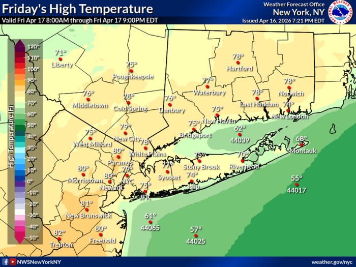 Although cooler than Thursday, Friday will see temperatures continue to run well above normal for this time of year. Expect highs in the 70s region-wide, with highs around 80 in northern NJ.